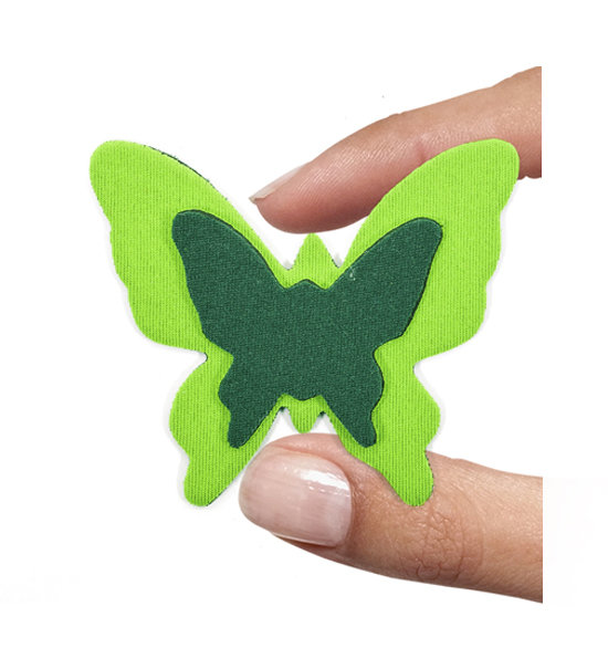 Sagoma in neoprene a forma di farfalla di 75×60 mm circa, spessa 3 mm di colore verdone (primo lato) e verde (secondo lato). Le caratteristiche principali di questo materiale sono la elasticità, la resistenza al taglio, allo schiacciamento ed all’invecchiamento atmosferico al calore. Articolo confezionato e venduto in bustine da un pezzo (2 sagome per pezzo) e/o multipli.