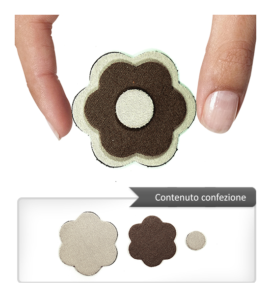 Sagoma in neoprene a forma di fiore di 55×55 mm circa, spessa 3 mm di colore avorio (primo lato) e marrone (secondo lato). Le caratteristiche principali di questo materiale sono la elasticità, la resistenza al taglio, allo schiacciamento ed all’invecchiamento atmosferico al calore. Articolo confezionato e venduto in bustine da un pezzo (3 sagome per pezzo) e/o multipli.