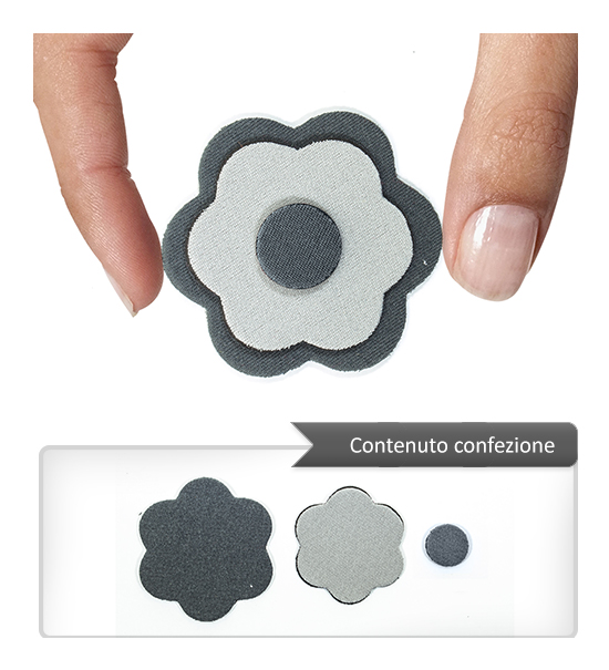 Sagoma in neoprene a forma di fiore di 55×55 mm circa, spessa 3 mm di colore grigio scuro (primo lato) e grigio chiaro (secondo lato). Le caratteristiche principali di questo materiale sono la elasticità, la resistenza al taglio, allo schiacciamento ed all’invecchiamento atmosferico al calore. Articolo confezionato e venduto in bustine da un pezzo (3 sagome per pezzo) e/o multipli.