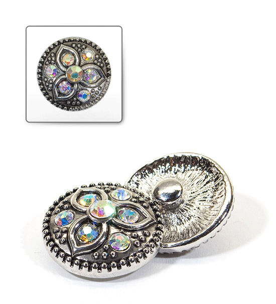 Bottone automatico decorativo in lega di metallo non ferroso, decorato con strass di varie misure. Il prezzo non include la basetta femmina che va acquistata a parte se già non la si possiede (art. 493). Questo bottone infatti è la parte decorativa intercambiabile che va a fissarsi sulla basetta femmina… per capire meglio vedi il video tutorial “Funny”