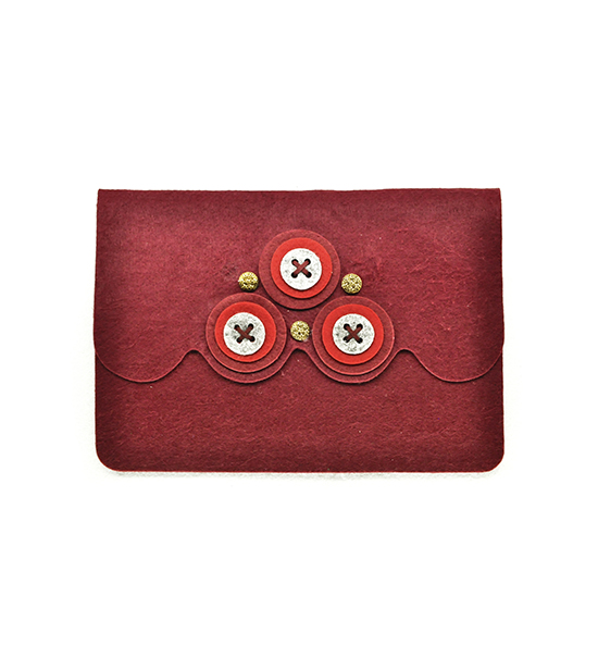 Kit fai-da-te “Creative kit” per realizzare astuccio porta tablet in feltro di colore bordeaux, busta contenente: sagome di feltro, matassina di filo, applicazioni varie e istruzioni pratiche.