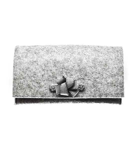 Kit fai-da-te “Creative kit” per realizzare pochette in feltro di colore grigio, busta contente: sagoma di feltro base, bottoni magnetici, matassina di filo, applicazioni varie e istruzioni pratiche.