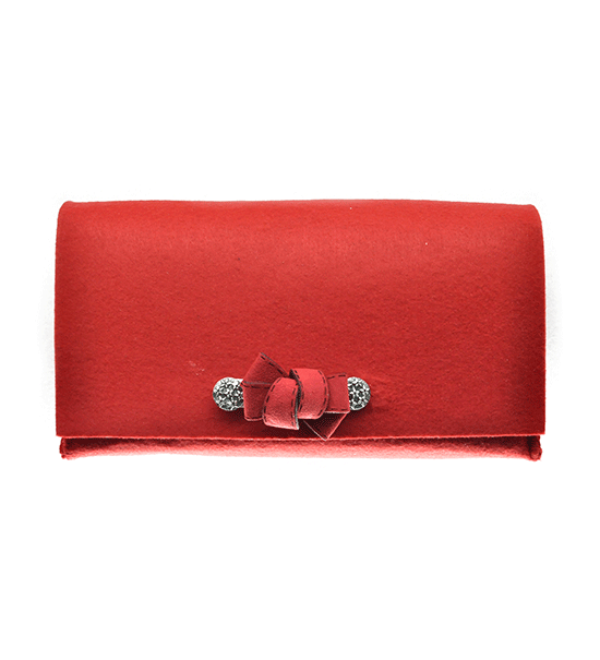 Kit fai-da-te “Creative kit” per realizzare pochette in feltro di colore rosso, busta contente: sagoma di feltro base, bottoni magnetici, matassina di filo, applicazioni varie e istruzioni pratiche.