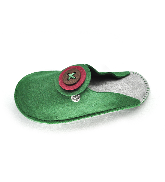 Kit fai-da-te “Creative kit” per realizzare ciabattina in feltro di colore verde prato, busta contente: sagoma di feltro base, matassina di filo e applicazioni varie (kit per un paio).