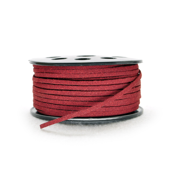 Cordoncino in scamosciato sintetico (70% nylon, 30% poliuretano), dello spessore di 3 mm circa, non tossico, di colore bordeaux. Disponibile anche in altri colori sulla sezione “prodotti > cordini > cordini in scamosciato del sito.