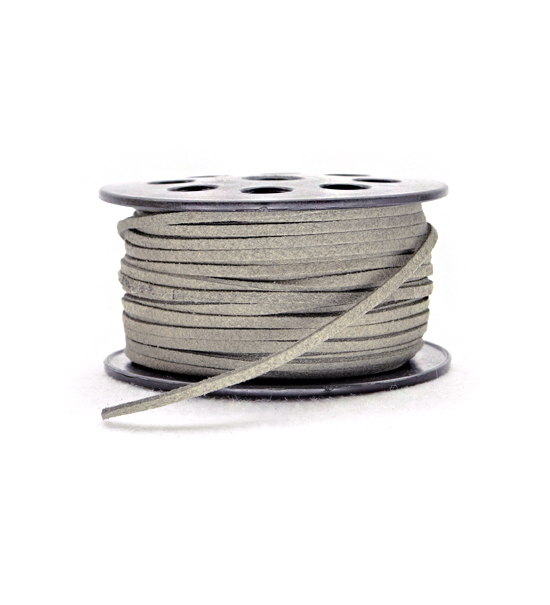 Cordoncino in scamosciato sintetico (70% nylon, 30% poliuretano), dello spessore di 3 mm circa, non tossico, di colore girgio scuro. Disponibile anche in altri colori sulla sezione “prodotti > cordini > cordini in scamosciato del sito.