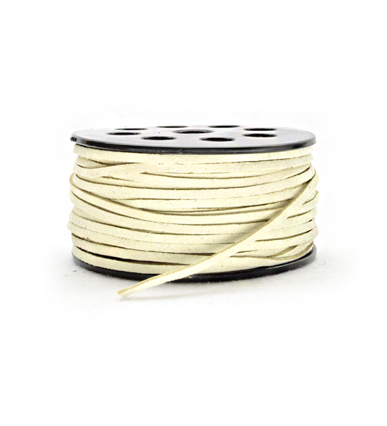 Cordoncino in scamosciato sintetico (70% nylon, 30% poliuretano), dello spessore di 3 mm circa, non tossico, di colore latte. Disponibile anche in altri colori sulla sezione “prodotti > cordini > cordini in scamosciato del sito.