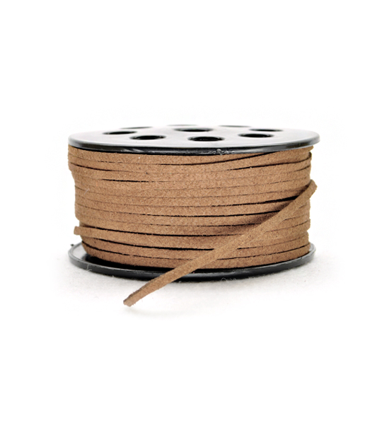 Cordoncino in scamosciato sintetico (70% nylon, 30% poliuretano), dello spessore di 3 mm circa, non tossico, di colore marrone chiaro. Disponibile anche in altri colori sulla sezione “prodotti > cordini > cordini in scamosciato del sito.
