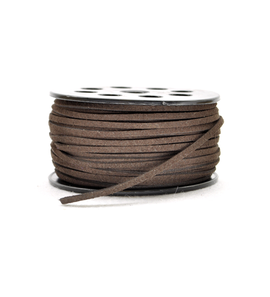 Cordoncino in scamosciato sintetico (70% nylon, 30% poliuretano), dello spessore di 3 mm circa, non tossico, di colore marrone. Disponibile anche in altri colori sulla sezione “prodotti > cordini > cordini in scamosciato del sito.