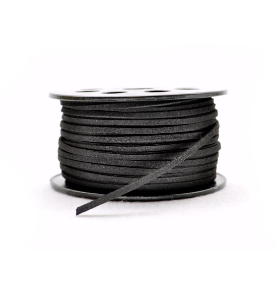 Cordoncino in scamosciato sintetico (70% nylon, 30% poliuretano), dello spessore di 3 mm circa, non tossico, di colore nero. Disponibile anche in altri colori sulla sezione “prodotti > cordini > cordini in scamosciato del sito.