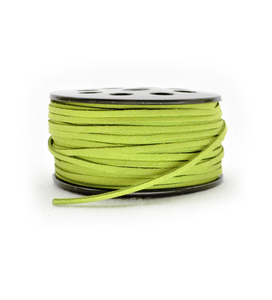 Cordoncino in scamosciato sintetico (70% nylon, 30% poliuretano), dello spessore di 3 mm circa, non tossico, di colore verde chiaro. Disponibile anche in altri colori sulla sezione “prodotti > cordini > cordini in scamosciato del sito.