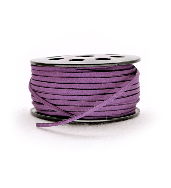 Cordoncino in scamosciato sintetico (70% nylon, 30% poliuretano), dello spessore di 3 mm circa, non tossico, di colore viola. Disponibile anche in altri colori sulla sezione “prodotti > cordini > cordini in scamosciato del sito.