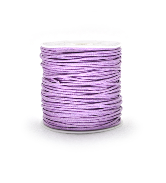 Cordoncino in cotone cerato (100% naturale), confezionato in bobine da 25 metri dello spessore di 1 mm circa, di colore lilla, disponibile anche in altri colori sulla sezione “prodotti > cordini > cordini in cotone cerato” del sito.
