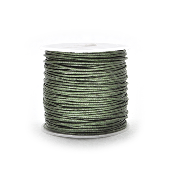 Cordoncino in cotone cerato (100% naturale), confezionato in bobine da 25 metri dello spessore di 1 mm circa, di colore verde oliva, disponibile anche in altri colori sulla sezione “prodotti > cordini > cordini in cotone cerato” del sito.