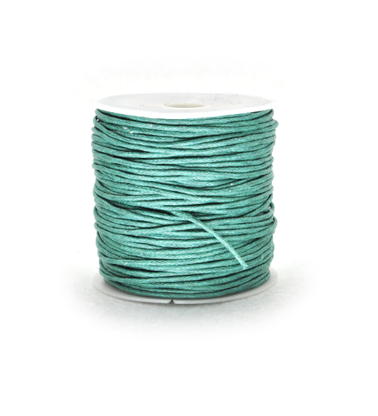 Cordoncino in cotone cerato (100% naturale), confezionato in bobine da 25 metri dello spessore di 1 mm circa, di colore verde petrolio, disponibile anche in altri colori sulla sezione “prodotti > cordini > cordini in cotone cerato” del sito.
