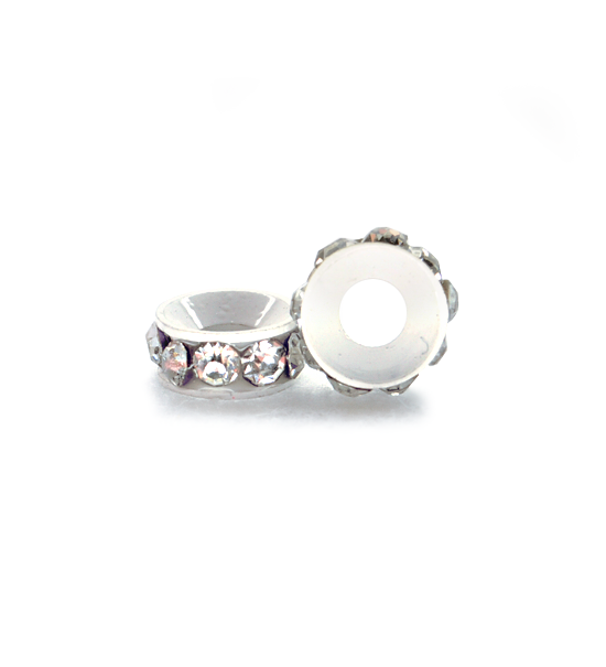 Perla distanziale ad anello in metallo, con diametro di 10 mm, decorata con strass lungo il bordo. Foro centrale di 4 mm circa.
