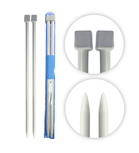 Due ferri da maglia in alluminio con terminale in plastica. Lunghezza di 40 cm, diametro di 10 mm e 49,2 grammi di peso (netto, busta esclusa). Confezionati e venduti in busta plastificata originale.