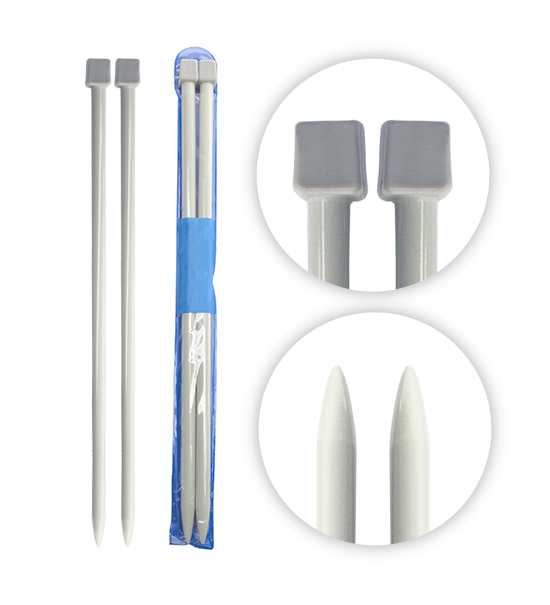 Due ferri da maglia in alluminio con terminale in plastica. Lunghezza di 40 cm, diametro di 12 mm e 55,8 grammi di peso (netto, busta esclusa). Confezionati e venduti in busta plastificata originale.