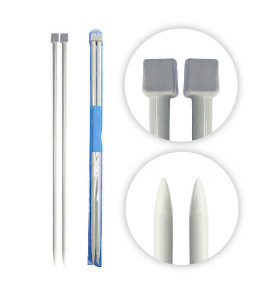 Due ferri da maglia in alluminio con terminale in plastica. Lunghezza di 40 cm, diametro di 5,5 mm e 23,4 grammi di peso (netto, busta esclusa). Confezionati e venduti in busta plastificata originale.