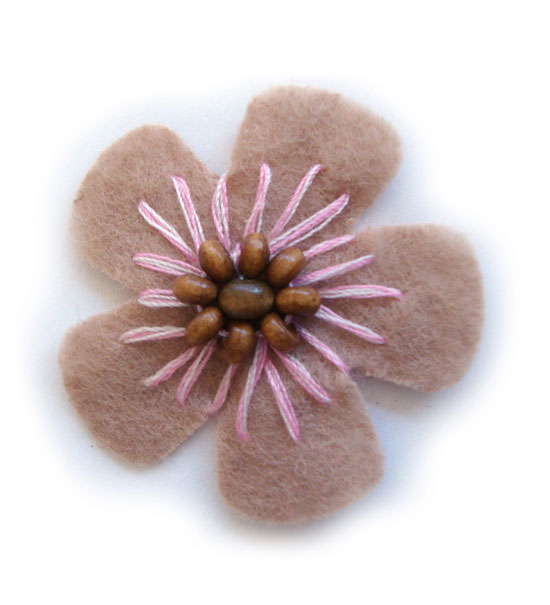 Fiorellino realizzato a mano con tessuto di panno lenci, ricamato con filo e perline di legno. Diametro del fiore mm.35 circa. Ideale per realizzare splendidi fermagli per capelli, applicarlo su T-shirts, camicie, jeans, bomboniere, o più semplicemente per decorare e abbellire tutti i tuoi accessori come astucci, borse, scarpe da ginnastica, zainetti, album, diari e molto altro.