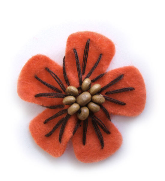 Fiorellino realizzato a mano con tessuto di panno lenci, ricamato con filo e perline di legno. Diametro del fiore mm.35 circa. Ideale per realizzare splendidi fermagli per capelli, applicarlo su T-shirts, camicie, jeans, bomboniere, o più semplicemente per decorare e abbellire tutti i tuoi accessori come astucci, borse, scarpe da ginnastica, zainetti, album, diari e molto altro.