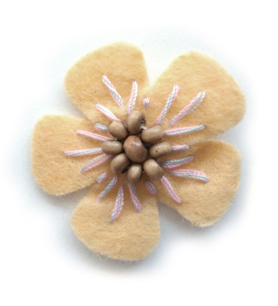 Fiorellino realizzato a mano con tessuto di panno lenci, ricamato con filo e perline di legno. Diametro del fiore mm.35 circa. Ideale per realizzare splendidi fermagli per capelli, applicarlo su T-shirts, camicie, jeans, bomboniere, o più semplicemente per decorare e abbellire tutti i tuoi accessori come astucci, borse, scarpe da ginnastica, zainetti, album, diari e molto altro.