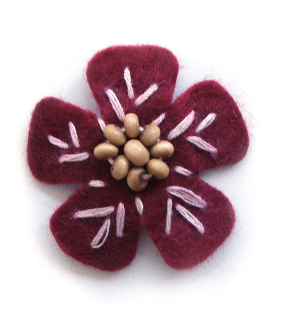 Fiorellino realizzato a mano con tessuto di panno lenci, ricamato con filo e perline di legno. Diametro del fiore mm.35 circa. Ideale per realizzare splendidi fermagli per capelli, applicarlo su T-shirts, camicie, jeans, bomboniere, o più semplicemente per decorare e abbellire tutti i tuoi accessori come astucci, borse, scarpe da ginnastica, zainetti, album, diari e molto altro.