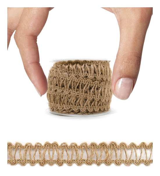 Passamaneria in canapa naturale stile zig zag mm.17 in bobina da 5 metri. Utilizzabile per decorare cesti, bomboniere, scatoline o per ornare tovagliette e accessori di vario genere