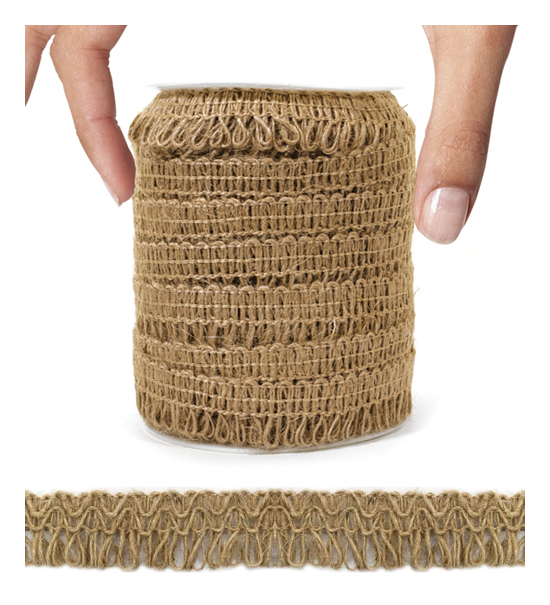 Passamaneria in canapa naturale stile frangietta mm.17 in bobina da 5 metri. Utilizzabile per decorare cesti, bomboniere, scatoline o per ornare tovagliette e accessori di vario genere