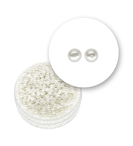 Perla in plastica tonda di colore bianco perlato, diametro esterno di circa 2 mm e foro centrale di 0,5 mm circa.