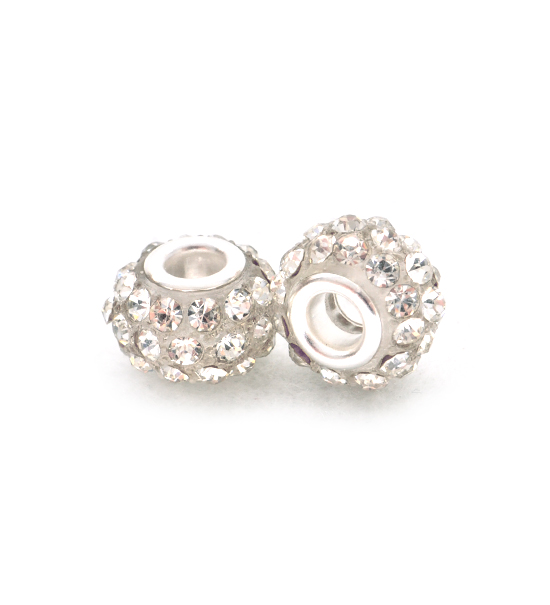 Perla sferica in materiale acrilico con dimensioni di 10×12 mm, decorata con 3 file di strass per un totale di 36 pezzi. Foro centrale di 5 mm circa e terminali in metallo.