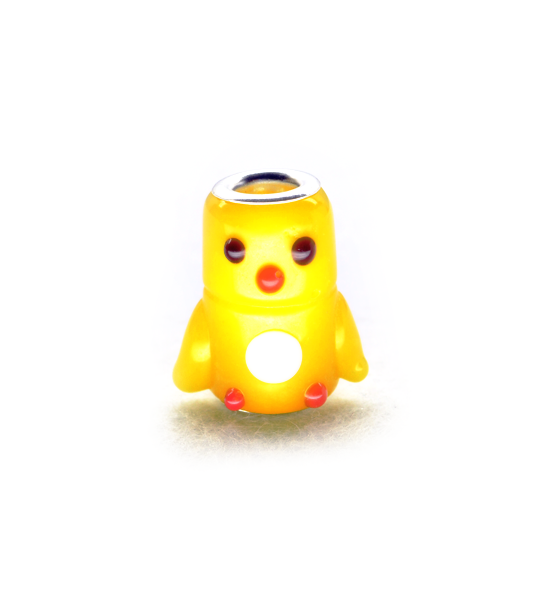 Perla ad animaletto in vetro da 14×10 mm circa, a forma di pulcino con foro di circa 4 mm e terminali in metallo, confezionato e venduto in buste da 1 pezzo e/o multipli, perla disponibile anche in altre forme sulla sezione “Prodotti > Perle > Ciambella > Vetro > Animaletti” del sito.