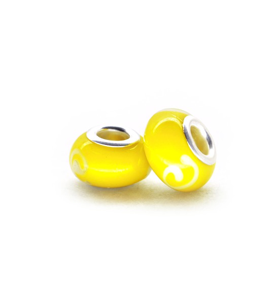 Perla sferica di 14×10 mm in vetro con decorazione bianca centrale, superficie liscia semiopaca di colore giallo. Con foro centrale di circa 4 mm e terminali in metallo, confezionata e venduta in buste da 2 pezzi e/o multipli. Perla disponibile anche in altri colori sulla sezione “Prodotti > perle > ciambella > vetro” del sito.