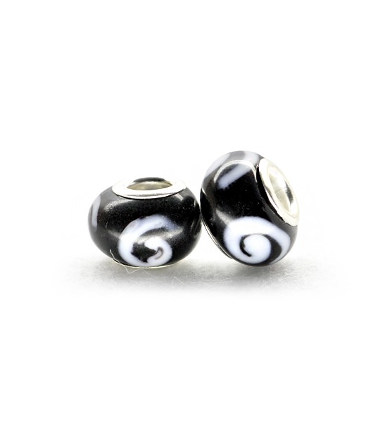 Perla sferica di 14×10 mm in vetro con decorazione bianca centrale, superficie liscia semiopaca di colore nero. Con foro centrale di circa 4 mm e terminali in metallo, confezionata e venduta in buste da 2 pezzi e/o multipli. Perla disponibile anche in altri colori sulla sezione “Prodotti > perle > ciambella > vetro” del sito.
