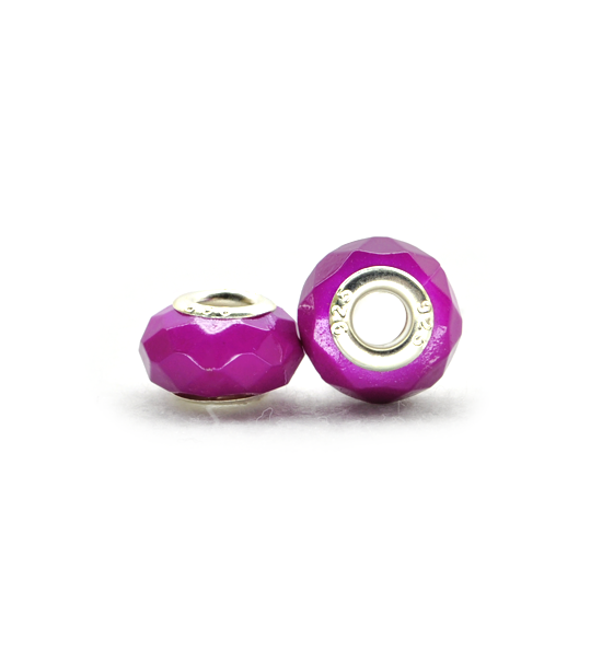 Perla ciambella lucida sfaccettata, di colore viola fluo, dimensioni di 14×10 mm.