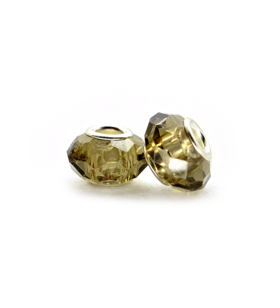 Perla sferica mezzo cristallo sfaccettata, di diametro 14×10 mm, dalla superficie lucida trasparente. Con foro centrale di circa 4 mm e terminali in metallo