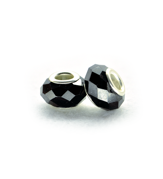 Perla sferica mezzo ‎cristallo sfaccettata, di diametro 14×10 mm, dalla superficie lucida trasparente. Con foro centrale di circa 4 mm e terminali in metallo
