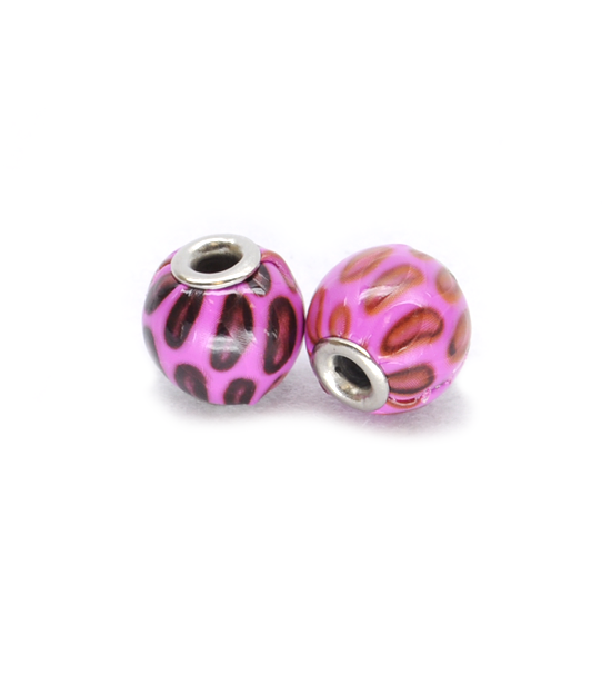 Perla sferica di diametro 14 mm, dalla superficie maculata semilucida rivestita in ecopelle di colore fuxia. Con foro centrale di circa 4 mm e terminali in metallo.