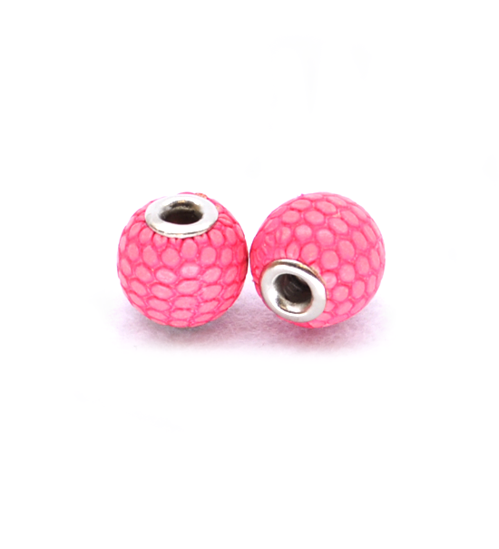 Perla sferica di diametro 14 mm, dalla superficie “pitonata” semiopaca rivestita in ecopelle di colore fuxia. Con foro centrale di circa 4 mm e terminali in metallo.