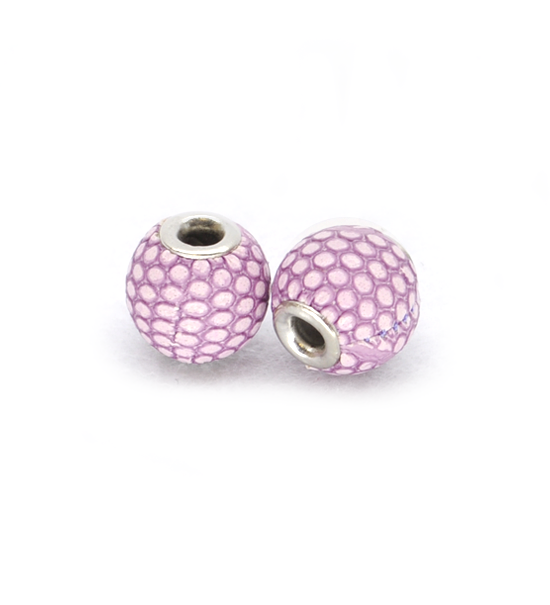 Perla sferica di diametro 14 mm, dalla superficie “pitonata” semiopaca rivestita in ecopelle di colore lilla. Con foro centrale di circa 4 mm e terminali in metallo.