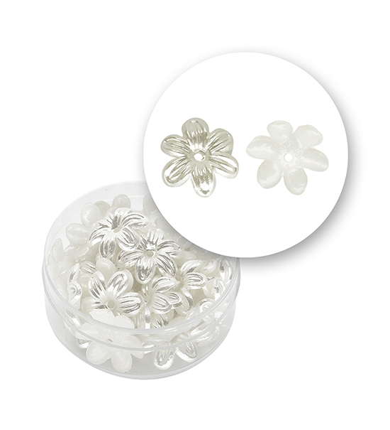 Perla in plastica forma corolla di colore bianco perlato, dimensioni di 14×3 mm circa e foro centrale di 1,5 mm circa.