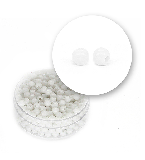 Perle in materiale acrilico con superficie liscia lucida di colore bianco (colore in pasta), diametro esterno di 4 millimetri.