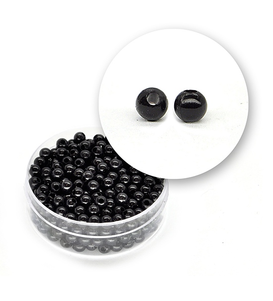 Perle in materiale acrilico con superficie liscia lucida di colore nero (colore in pasta), diametro esterno di 4 millimetri.