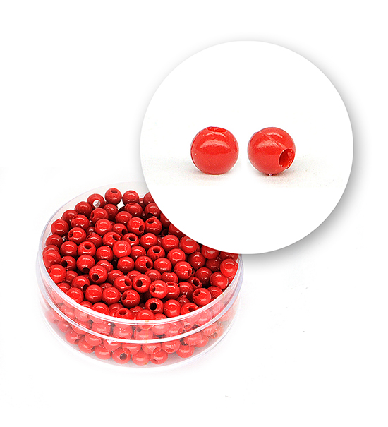 Perle in materiale acrilico con superficie liscia lucida di colore rosso (colore in pasta), diametro esterno di 4 millimetri.