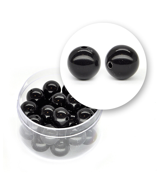 Perle in plastica nera con superficie liscia di forma tonda, diametro esterno di 10 mm e foro di 2 mm. Confezionate e vendute in scatoline di 44×25 mm, contenenti circa 30 pezzi per un peso di 17,3 grammi circa. N.B. la quantità ed il peso di questo articolo hanno valore esclusivamente indicativo.