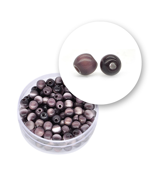 Perle in vetro “occhi di gatto” semilucide di colore viola, con diametro esterno di circa 5 mm e foro centrale di 1 mm circa.