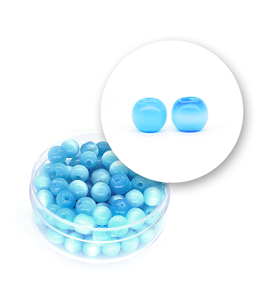 Perle in vetro “occhi di gatto” semilucide di colore celeste, con diametro esterno di circa 6 mm e foro centrale di 1,2 mm circa.