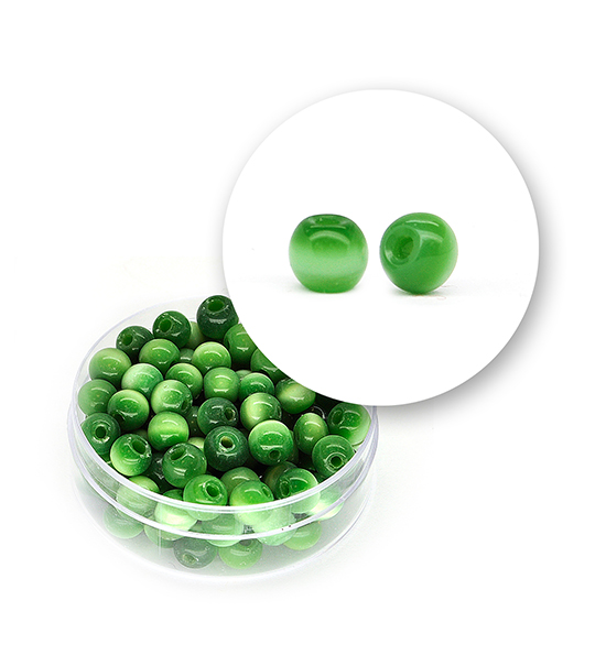 Perle in vetro “occhi di gatto” semilucide di colore verde, con diametro esterno di circa 6 mm e foro centrale di 1,2 mm circa.