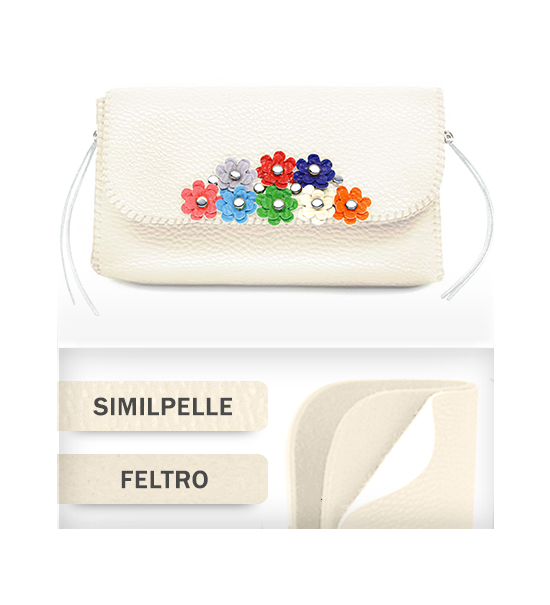 Kit fai-da-te “Creative kit” per realizzare pochette piccola in similpelle e feltro di colore avorio, busta contente: sagoma di feltro base, sagoma di similpelle base, matassina di filo, applicazioni varie.