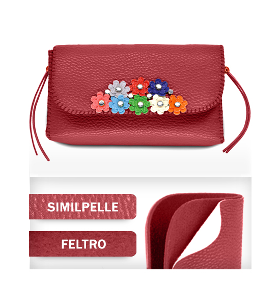 Kit fai-da-te “Creative kit” per realizzare pochette piccola in similpelle e feltro di colore rosso scuro, busta contente: sagoma di feltro base, sagoma di similpelle base, matassina di filo, applicazioni varie.